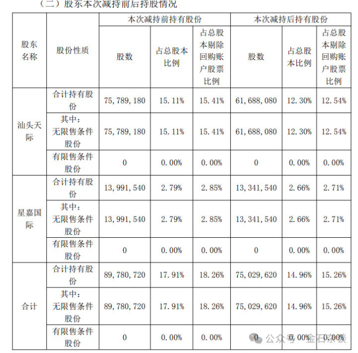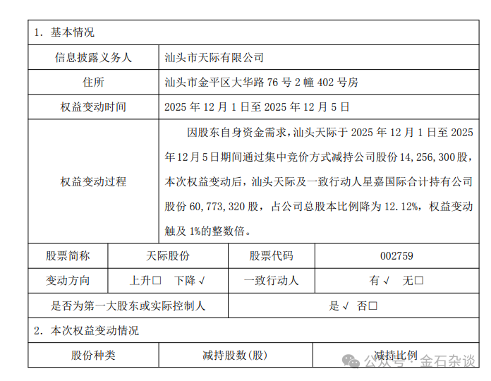 金石杂谈查询发现,天际股份实控人汕头天际在12月1日至5日通过集中竞价方式减持14256300股或2.84%股份,减持完成后,天际股份实控人之一的汕头天际持股从12.3%缩水至9.46%,实控人及一致行动人持股只剩下12.12%。
