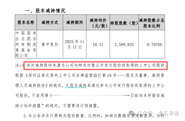 不过,金石杂谈查询发现,此前其他上市公司有定增减持先例,比如中水渔业,该公司大股东混改基金11月17日减持,11月19日发布公告,公告中明确写明“减持股份来源为公司向特定对象公开发行股份而取得的上市公司股份”。