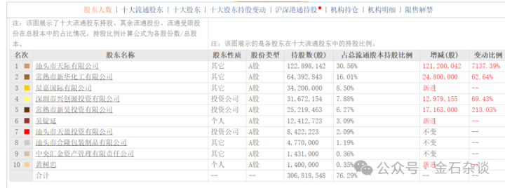 金石杂谈查询发现,2019年底,汕头天际和一致行动人星嘉国际分别持股30.56%和8.5%,合计控制近40%的股份。