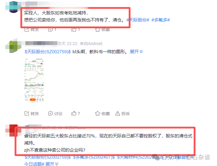对此,有股民高呼:曾经的天际前五大股东占比接近70%,现在的天际自己都不要控股权了,股东的清仓式减持;还有股民表示,实控人、大股东如丧考妣的减持,想把公司卖给你,清仓;这减持份额,是要直接把公司卖给家人们吗?减持龙牛逼!